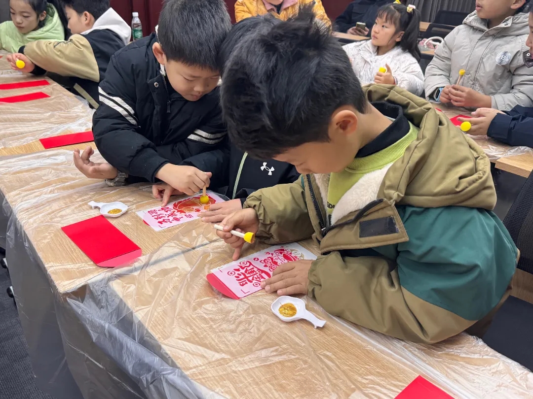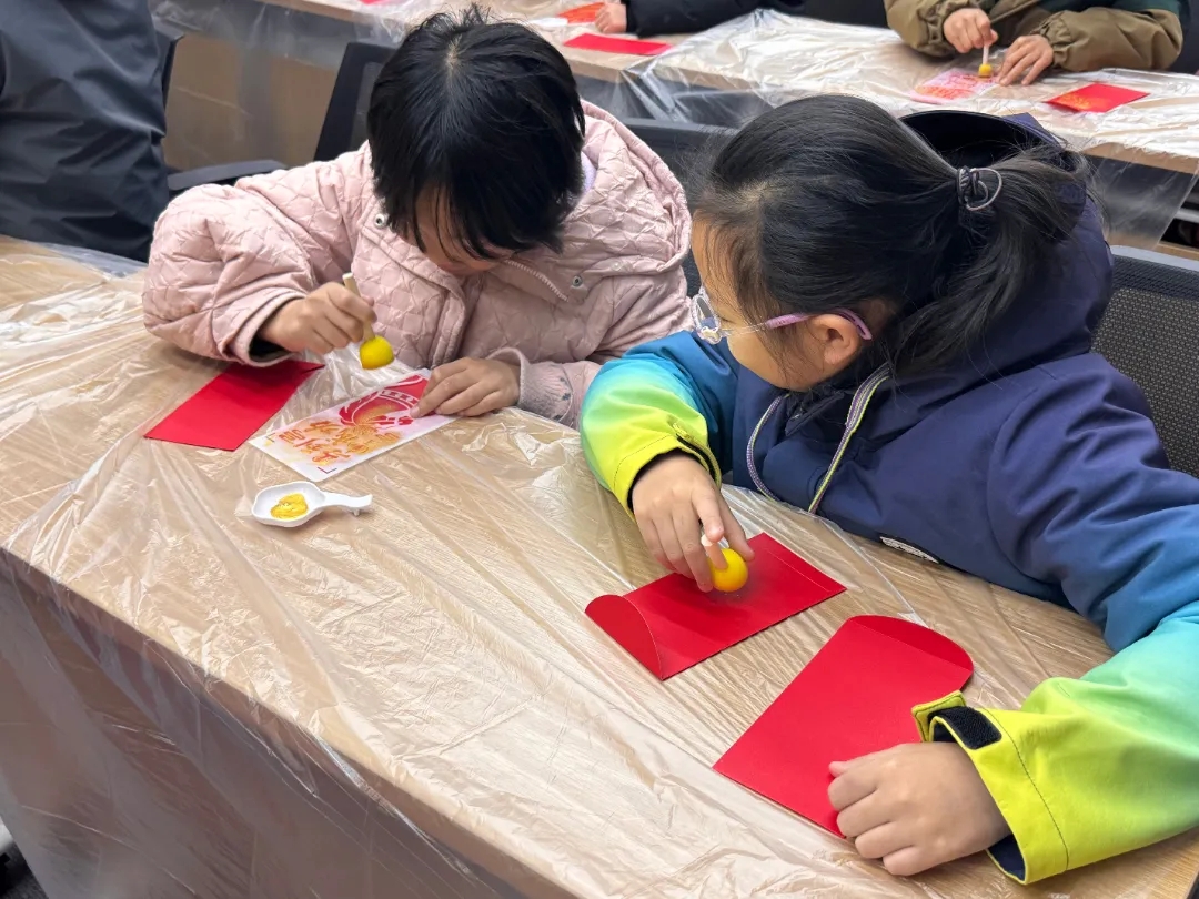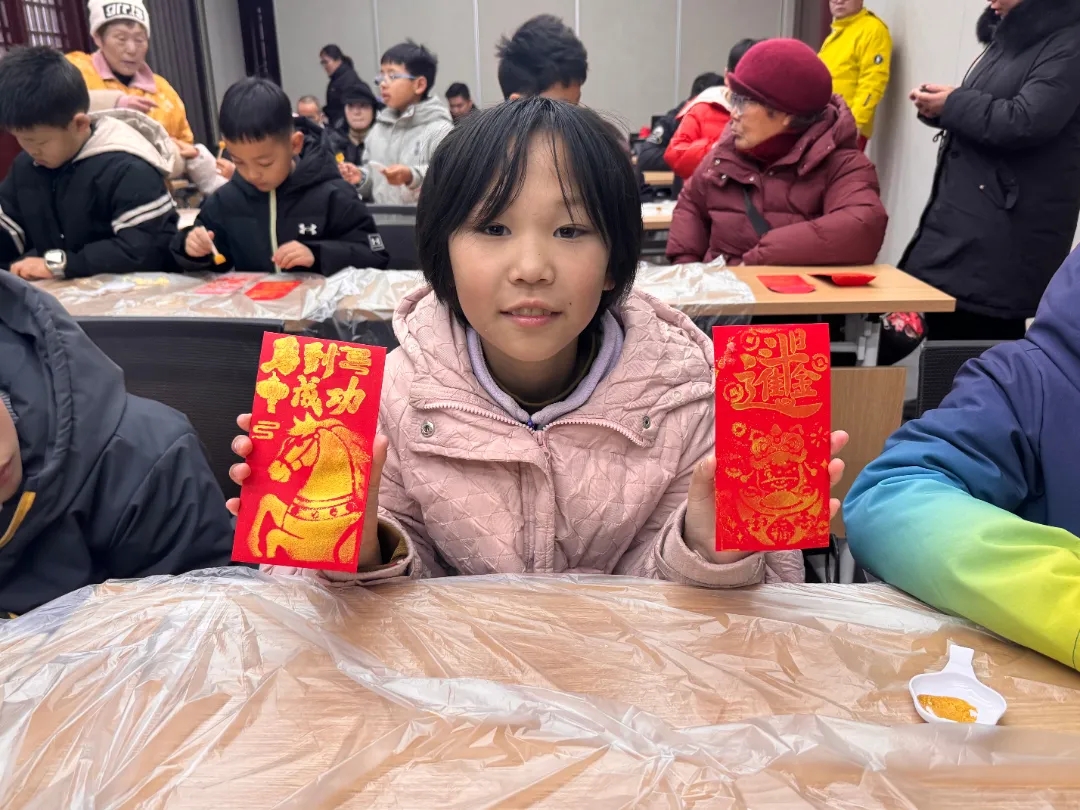 年味浓情处,指尖传福意。“指尖拓福”手工红包拓印环节,在工作人员的指导下,孩子们小心翼翼地蘸墨、拓印、装饰,一个个色彩斑斓、充满童趣的专属红包在指尖诞生。大家捧着自己的作品,脸上洋溢着满满的成就感,将新年的美好期许藏于其中,让传统年味与创意巧思碰撞出温暖火花。
