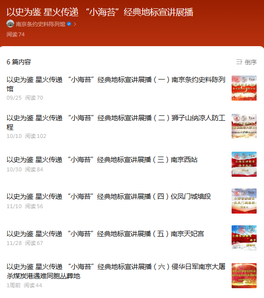“小海苔”讲解员培育实践团是南京条约史料陈列馆与下关街道东炮台社区联合创立的青少年志愿者品牌项目。今年“小海苔”们完成第四期培训实践活动,并在暑期打卡了九处历史地标,以“时间轴”为脉络,用六期视频,线上讲述从1842年《南京条约》的签订、1937年煤炭港丛葬地铭记国殇,到1949年前后铁路地下党小组的红色传承的故事,让红色基因在新时代的街巷肌理中生生不息。