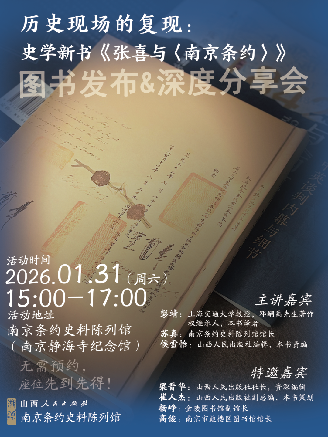2026年1月31日(周六)下午15:00—17:00,山西人民出版社将在《南京条约》议约地静海寺(现南京条约史料陈列馆),举办《张喜与〈南京条约〉》新书发布暨深度分享会。欢迎加入这场穿越时空的“复现”之旅:
