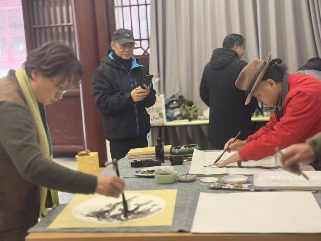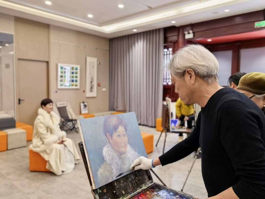 开幕式结束后,一场别开生面的“新春画家笔会”在活动区举行。十余位参展画家铺纸研墨,即兴创作。围绕“金陵春色”与“时代意象”等主题,艺术家们以水墨、彩墨等不同形式挥洒才思,在互动切磋中完成了多幅生动鲜活的作品。主办方更是安排了模特现场写生,吸引了不少观众驻足观赏,他们得以近距离感受艺术创作的瞬间灵感与笔墨韵味,实现了展览从静态观赏到动态参与的有效延伸。画家笔会后,曹建宁、王立庆、季春红三位画家将作品赠与南京条约史料陈列馆收藏。